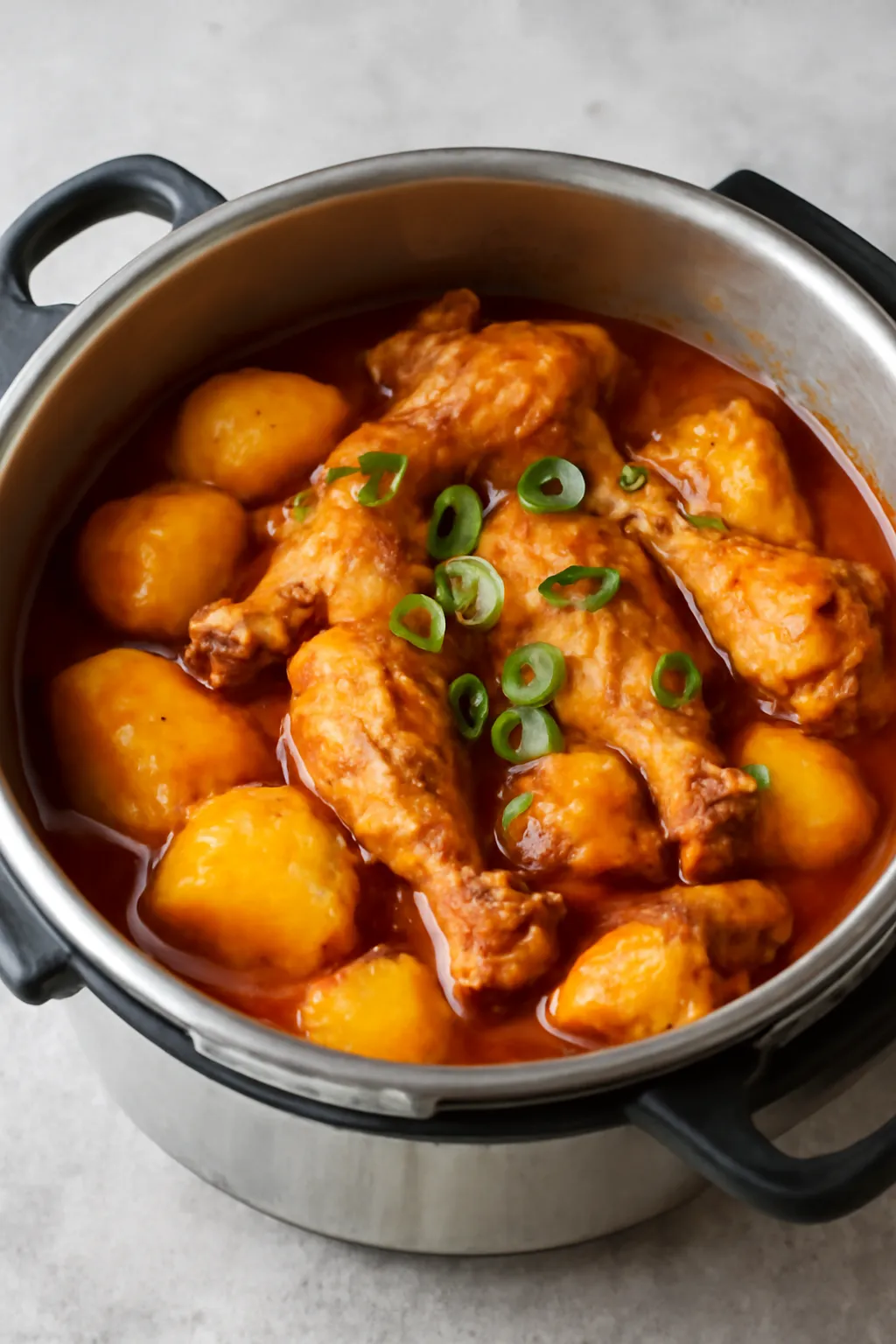 압력솥에 재료 넣기 압력솥에 닭고기, 감자, 양파, 마늘, 대파를 넣고 양념장을 넣습니다. 재료가 충분히 잠길 정도로 물을 부은 뒤, 뚜껑을 닫고 중불에서 약 15분 정도 압력을 가합니다.