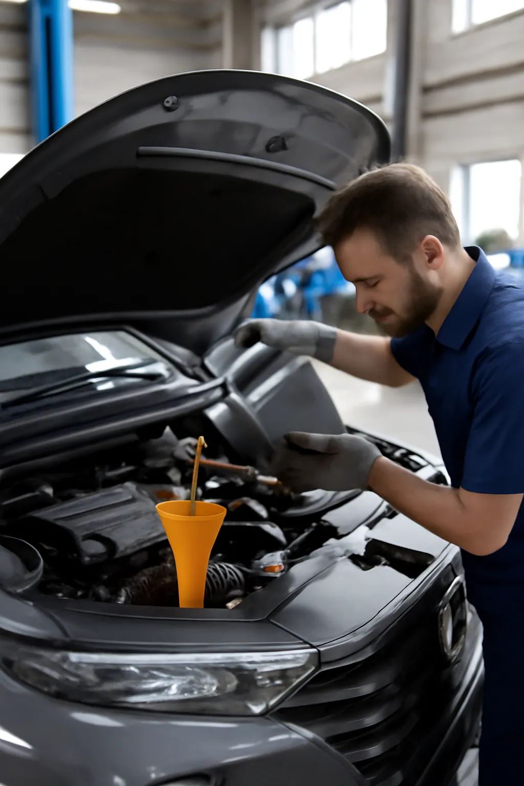 4. 오일 주입 새로운 엔진오일을 주입한 후, 오일의 양을 정확히 확인합니다.
